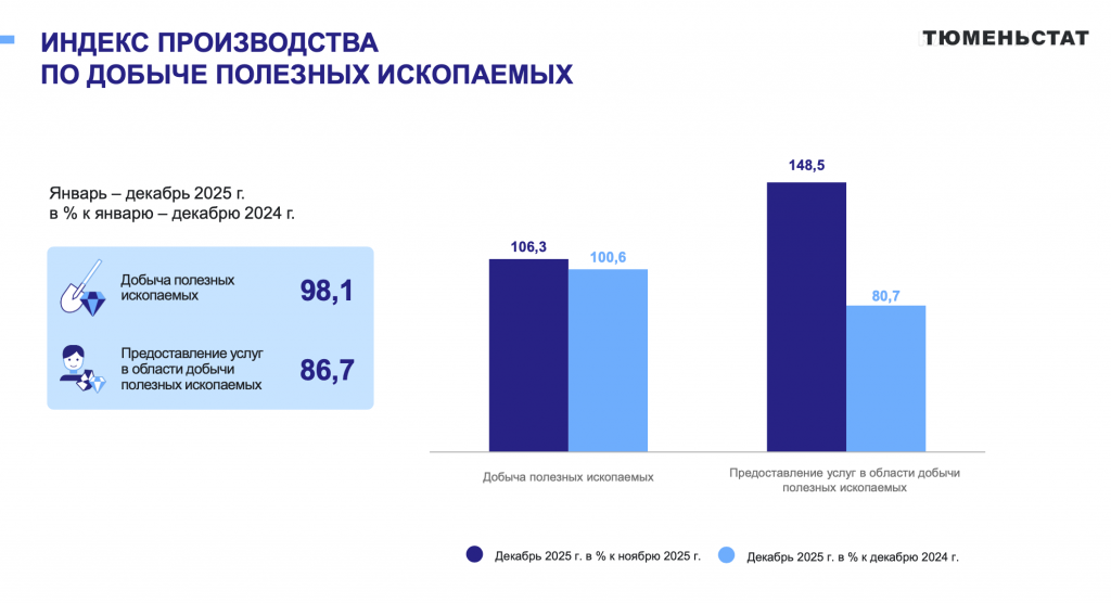 Негативная динамика фиксируется на фоне замедления ключевой для региона нефтегазодобычи. Основной удар по показателям нанесла деятельность по добыче полезных ископаемых, где спад составил 1,9% после падения на 4,9% годом ранее. В частности, добыча попутного нефтяного газа сократилась до 26,586 млрд кубометров, что на 2,5% ниже показателей предыдущего года (в 2024 году падение составляло 4,3%).