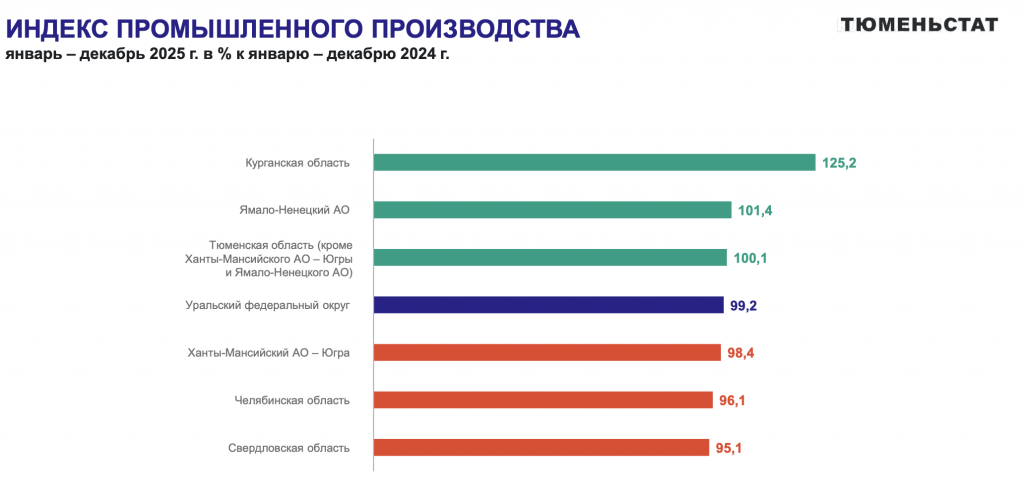 Промышленное производство в Ханты-Мансийском автономном округе по итогам 2025 года сократилось на 1,6% по сравнению с уровнем 2024 года, следует из данных Тюменьстата. Для сравнения: в 2024 году падение было более глубоким — индекс промпроизводства составлял 96,2% к уровню 2023 года, то есть спад на 3,8%. Формально темпы падения замедлились, однако за этой статистикой скрываются опасные тенденции: нефтяники замораживают инвестиционные программы, сворачивается бурение, а производство стройматериалов и лесопереработка уходят в глубокий минус, сигнализируя о сжатии инвестиционного спроса.