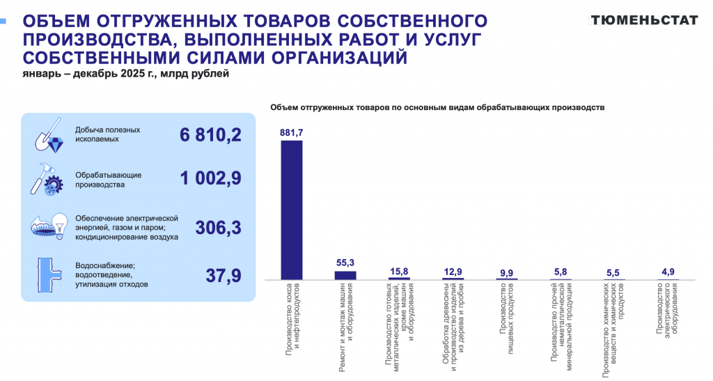 По итогам 2025 года объём отгруженных товаров собственного производства в ХМАО составил в добыче полезных ископаемых 6 810,2 млрд рублей, что на 23% ниже уровня 2024 года, когда этот показатель достигал 8 847,2 млрд рублей. В обрабатывающих производствах отгрузка снизилась на 7,6% — с 1 085,1 до 1 002,9 млрд рублей. При этом обеспечение электроэнергией, газом и паром, напротив, показало рост на 16,7% (до 306,3 млрд рублей), а водоснабжение и утилизация отходов прибавили 7,7% (до 37,9 млрд рублей). В структуре обработки лидирует производство кокса и нефтепродуктов с объёмом 55,3 млрд рублей, что на 9,3% выше прошлогоднего уровня (в 2024 году было 50,6 млрд). Ремонт и монтаж машин и оборудования вырос на 20,6% (до 15,8 млрд рублей) (в 2024 году было 13,1 млрд), тогда как обработка древесины и производство деревянных изделий сократились на 19,9% (до 12,9 млрд рублей) (в 2024 году было 16,1 млрд).