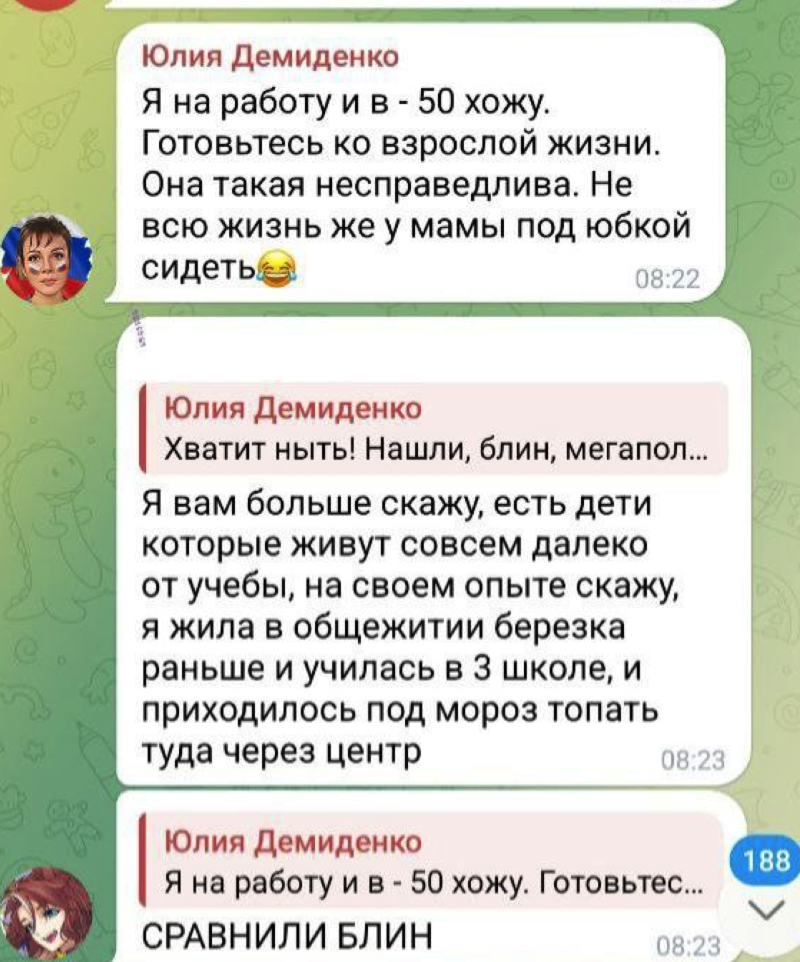 В подтверждение своей позиции сотрудница мэрии привела личный опыт, вспоминая собственные школьные годы: «Я вам больше скажу, есть дети которые живут совсем далеко от учебы, на своем опыте скажу, я жила в общежитии березка раньше и училась в 3 школе, и приходилось под мороз топать туда через центр». Школьники парировали это замечание лаконичным «сравнили блин». Скриншоты переписки мгновенно разлетелись по родительским и школьным чатам, вызвав волну возмущения, которая быстро вышла за пределы локальных групп.