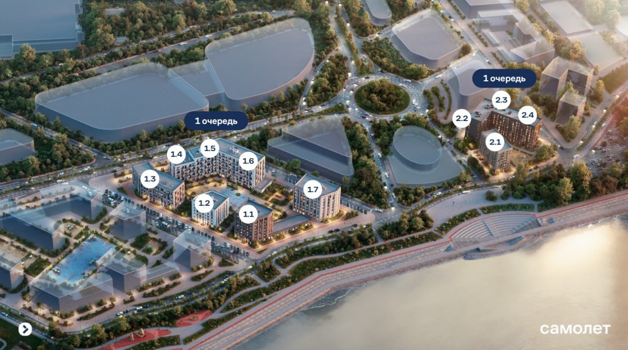 На первом этапе, завершение которого запланировано на 2028 год, будет возведена первая из пяти очередей — квартал бизнес-класса «Юнити». По замыслу девелопера, квартал будет включать в себя три жилых комплекса. Его архитектурное решение было обнародовано «Самолетом» еще в ноябре 2024 года. Он предполагает среднеэтажное строительство (6–8 этажей). Общий объем первой очереди составит примерно 272 квартиры.
