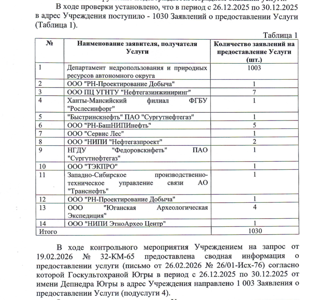 Более того, проверка установила, что в тот же период — с 26 по 30 декабря 2025 года — сам департамент недропользования направил в адрес Госкультохраны Югры всего два заявления и одно письмо на проверку 19 земельных участков. Это вся реальная потребность департамента. А 1003 заявки, поступившие в учреждение, не имели под собой никакого реального запроса.