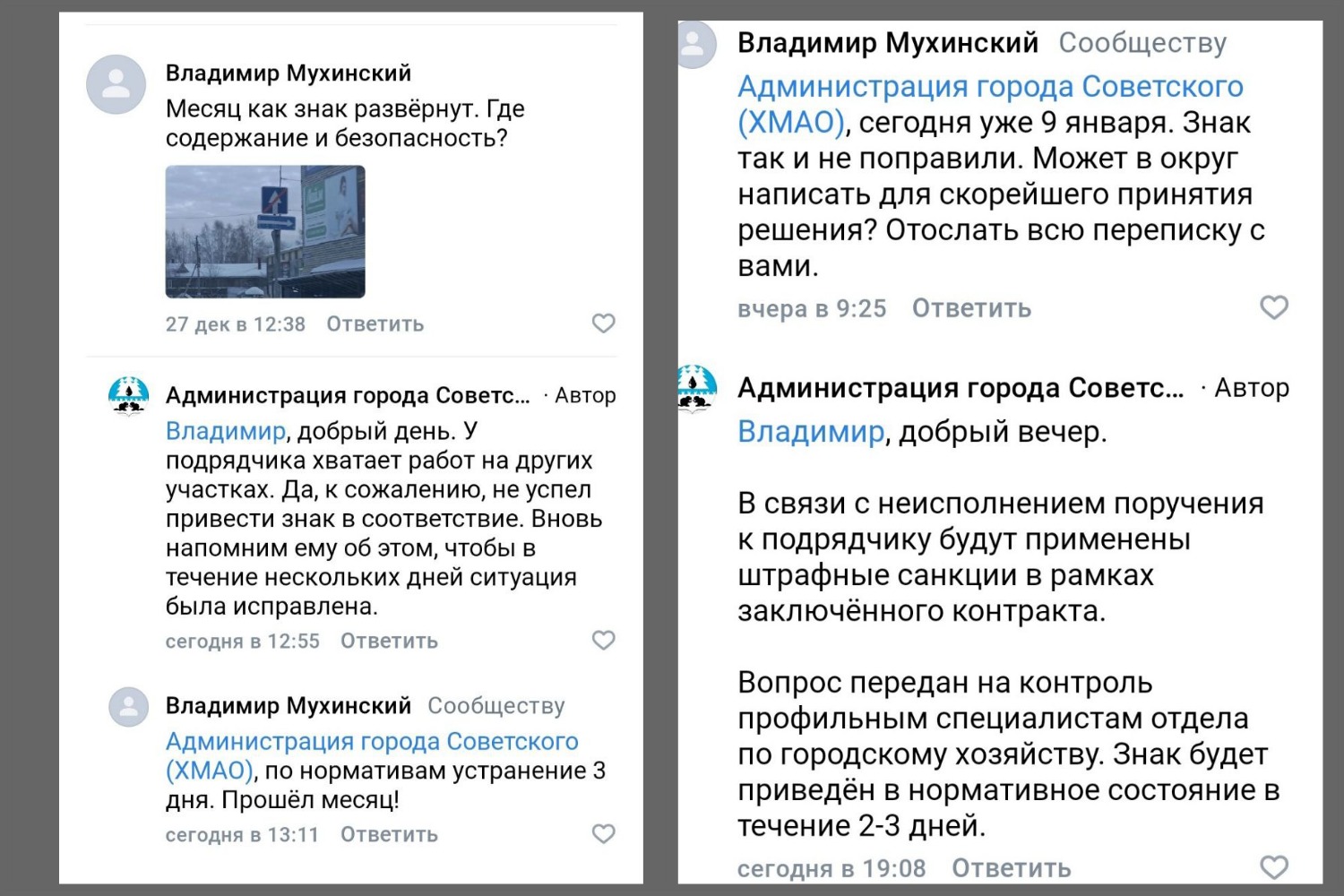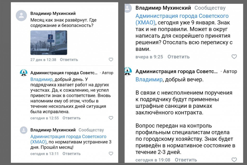 В своем собщении житель приложил переписку с властями, из которой следует, что вопрос не решался с ноября предыдущего года. В ответах администрации фигурировали отсылки к загруженности подрядчика «из-за большого объёма работ», а затем — к сильным морозам, которые якобы мешали проведению работ. «По нашей информации, знак поправят завтра: сегодня и вчера это сделать не удалось из-за сильных морозов», — ответили представители администрации непрсредственно на пост жителя в соцсетях губернатора.