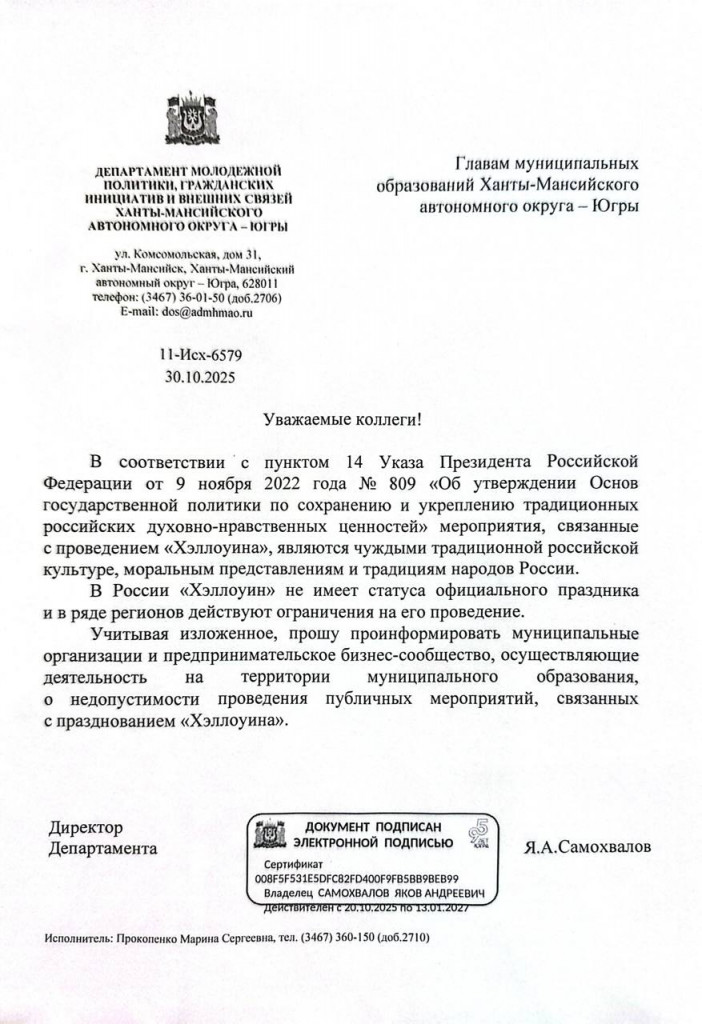 Власти Ханты-Мансийского автономного округа (ХМАО) указали на недопустимость проведения публичных мероприятий, посвященных «Хэллоуину», и поручили главам местных администраций проинформировать об этом муниципальные организации и бизнес-сообщество. Соответствующие письма за подписью директора департамента молодежной политики, гражданских инициатив и внешних связей Якова Самохвалова были разосланы главам городов и районов 30 октября.